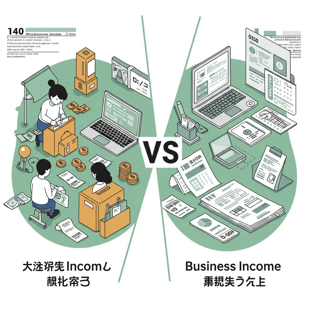 まず基本的な違いを押さえておきましょう。雑所得は、他の9つの所得区分(事業・給与・退職・山林・譲渡・配当・不動産・利子・一時)に当てはまらない所得のことで、「その他の所得」として位置づけられています。一方、事業所得は事業として継続的に利益を得ている場合の所得区分です。